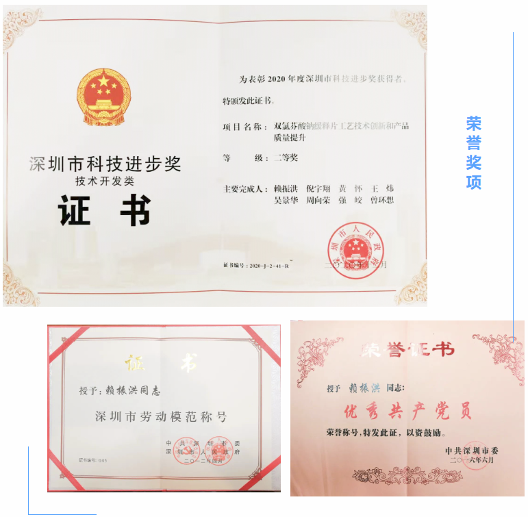 作为国药致君劳模工匠的优秀代表,赖振洪同志长期从事药物研发、产业化等技术工作,负责推进多项拳头产品一致性评价项目,用探索创新、深躬笃行践行了“护佑生命、关爱健康”的企业理念,攻克了核心品种迪根产业化热熔设备、头孢克肟颗粒杂质Z难题等多项技术难关。同时赖振洪同志在技术创新领域持续深耕,目前已获得发明专利授权5项,实用新型专利1项。个人先后荣获“深圳市劳动模范”、“深圳市优秀共产党员”、“深圳市科技进步二等奖”、“深圳市龙华区总工会劳模和工匠人才创新工作室”等多项称号。