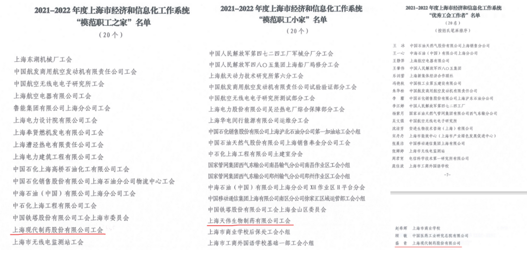 近日,上海市经济和信息化工作系统工会工作委员会下发文件,对下属近百家基层单位工会组织进行表彰,国药现代工会喜获2021-2022年度“模范职工之家”荣誉称号,国药天伟分工会喜获2021-2022年度“模范职工小家”荣誉称号,国药现代后勤保障部主任盛青喜获2021-2022年度“优秀工会工作者”荣誉称号。