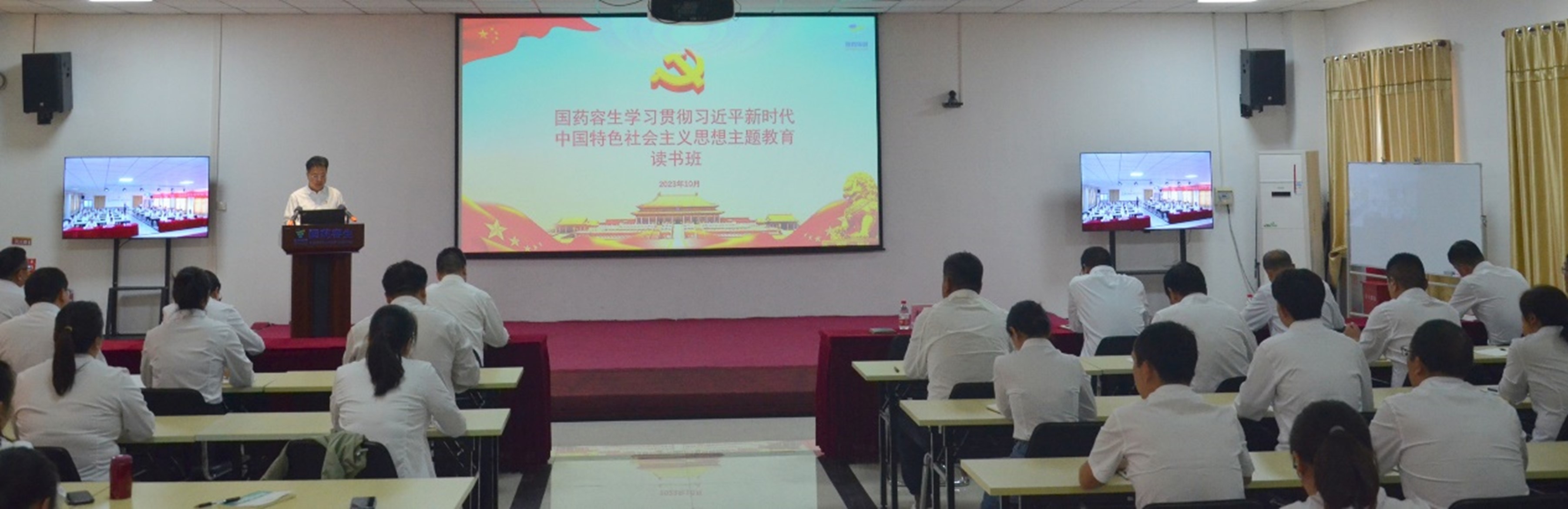 10月24日-27日,国药容生举办主题教育读书班。开班仪式上,邀请到郑州市委党校李敬教授作了专题党课宣讲。在学原文、悟原理环节中,学员们坚持全面系统学、及时跟进学、联系实际学,深学细悟《习近平新时代中国特色社会主义思想专题摘编》等主题教育指定学习书籍,结合本职工作和所学内容开展学习研讨,切实把主题教育作为补短板、强本领的“制胜法宝”。